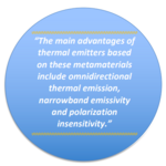 The main advantages of thermal emitters based on these metamaterials include omnidirectional thermal emission, narrowband emissivity and polarization insensitivity. Importantly, the epsilonnear-zero and epsilon-near-pole emitters also function in reverse as highly effective thin absorbers.