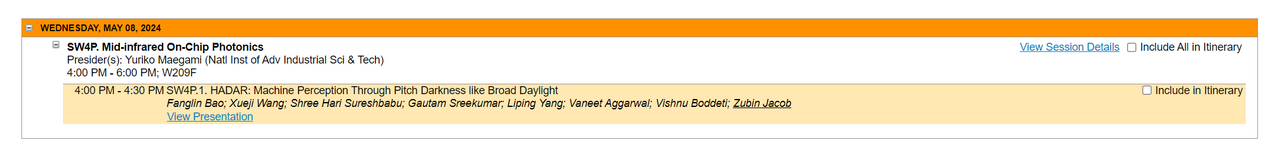Prof. Zubin Jacob will deliver an invited talk titled "HADAR: Machine perception through pitch darkness like broad daylight" at CLEO 2024.